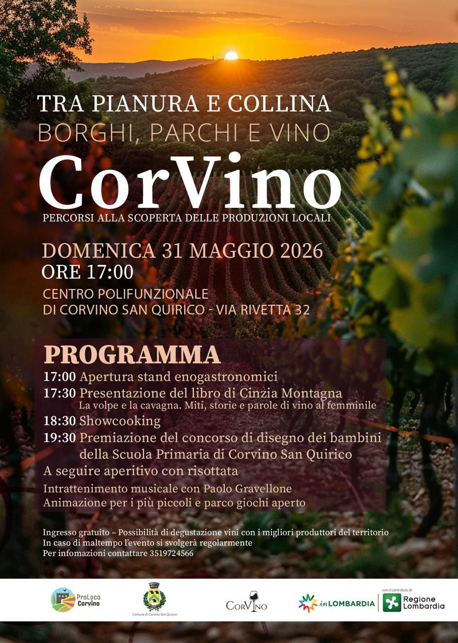Domenica 31 maggio 2026, il cuore dell’Oltrepò Pavese torna protagonista con CorVino, un evento che celebra l’identità del territorio attraverso enogastronomia, cultura e intrattenimento. Nella suggestiva cornice collinare di Corvino San Quirico, tra vigneti e panorami che raccontano la tradizione vitivinicola locale, prende vita un’esperienza immersiva pensata per visitatori, famiglie e appassionati.