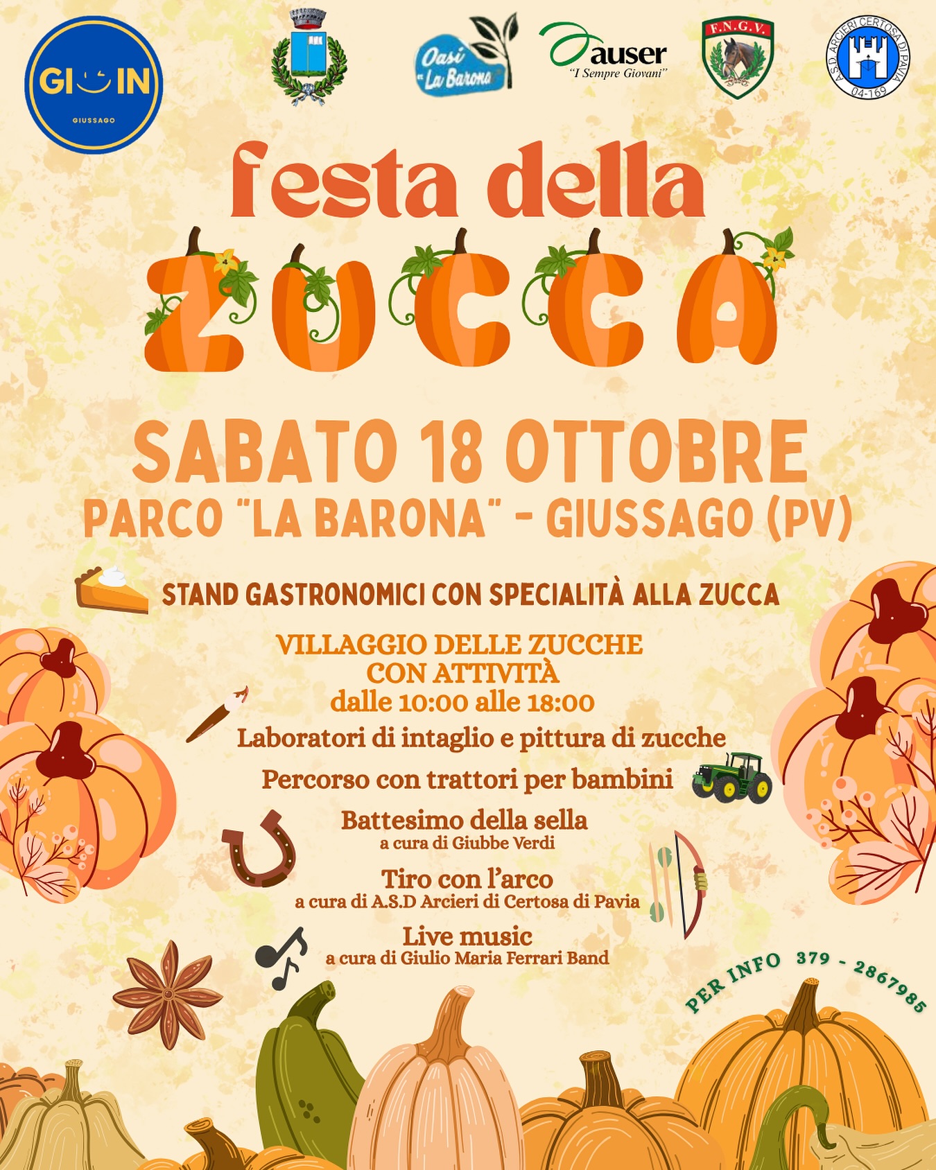 Sabato 18 ottobre 2025, il Parco “La Barona” di Giussago (PV) ospita la nuova edizione della Festa della Zucca, un evento autunnale dedicato al gusto e alle tradizioni del territorio pavese.