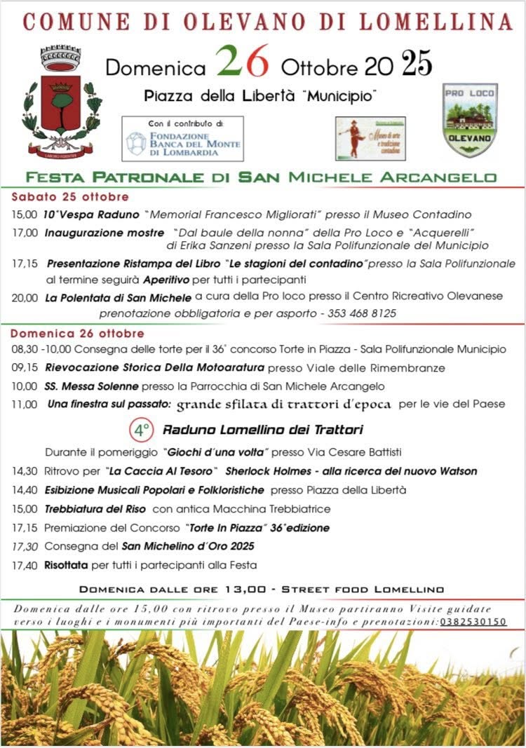 Olevano di Lomellina celebra il suo patrono, San Michele Arcangelo, con un weekend ricco di tradizione, gusto e storia. Sabato 25 e domenica 26 ottobre, il paese si anima con eventi, mostre, musica e sapori tipici della Lomellina, in un’atmosfera di festa che coinvolge grandi e piccoli.