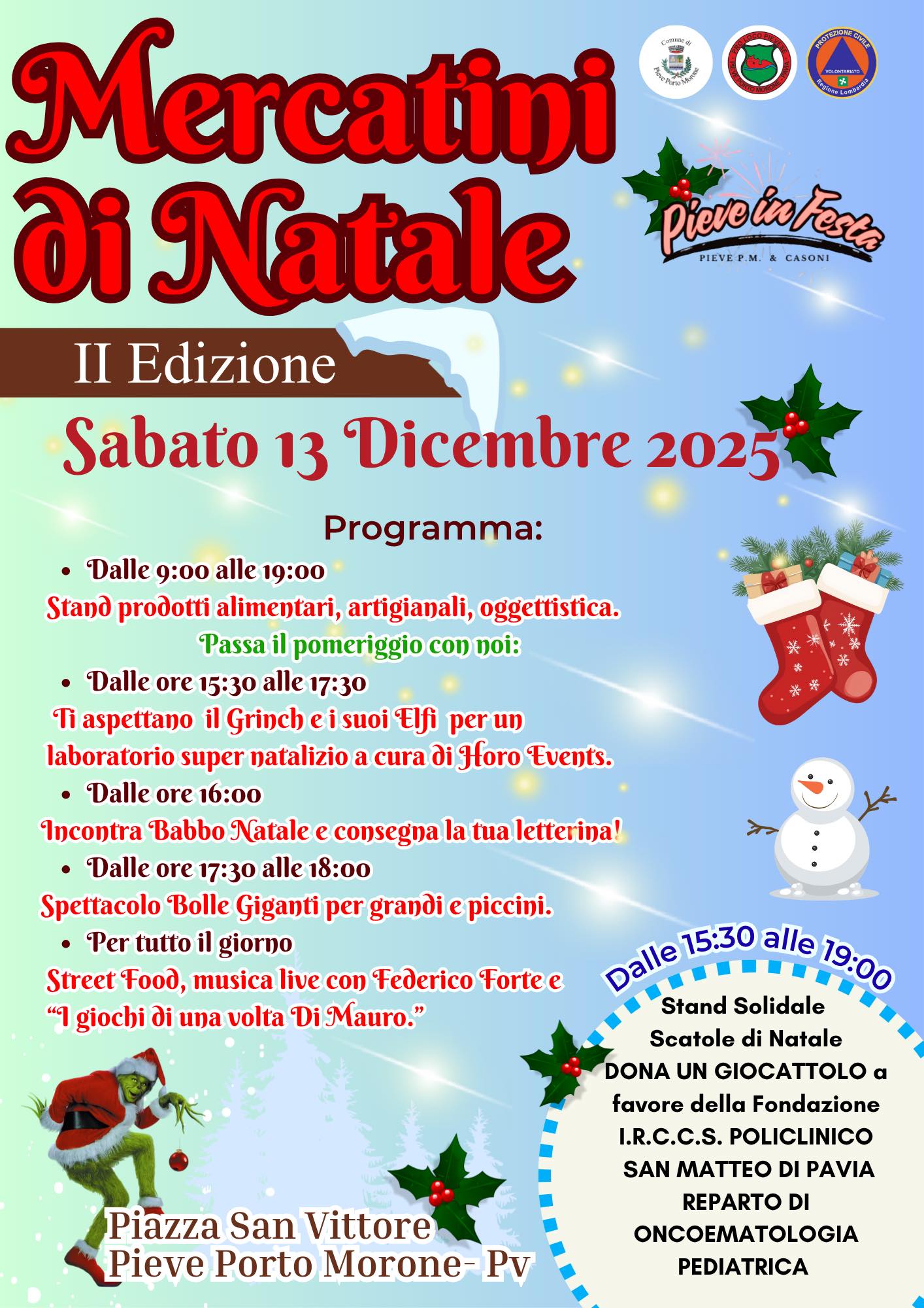 La magia del Natale arriva a Pieve Porto Morone con la II Edizione dei Mercatini di Natale, in programma sabato 13 dicembre 2025 nella suggestiva Piazza San Vittore. Un appuntamento atteso da famiglie, bambini e appassionati delle atmosfere natalizie, che potranno immergersi per un’intera giornata tra luci, sapori, artigianato e intrattenimenti pensati per tutte le età.
