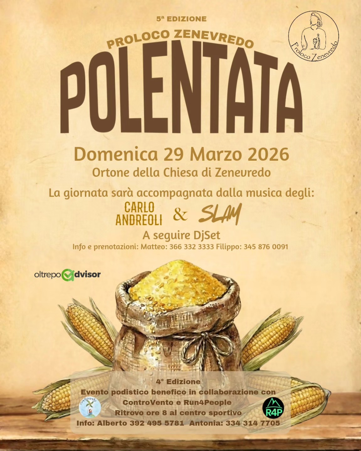 Domenica 29 marzo 2026 il piccolo borgo di Zenevredo, nell’Oltrepò Pavese, si prepara ad accogliere una delle feste più attese della primavera: la storica Polentata di Zenevredo, giunta alla sua quinta edizione. Un appuntamento che unisce gastronomia, musica dal vivo e sport solidale, richiamando ogni anno visitatori e appassionati delle tradizioni locali.