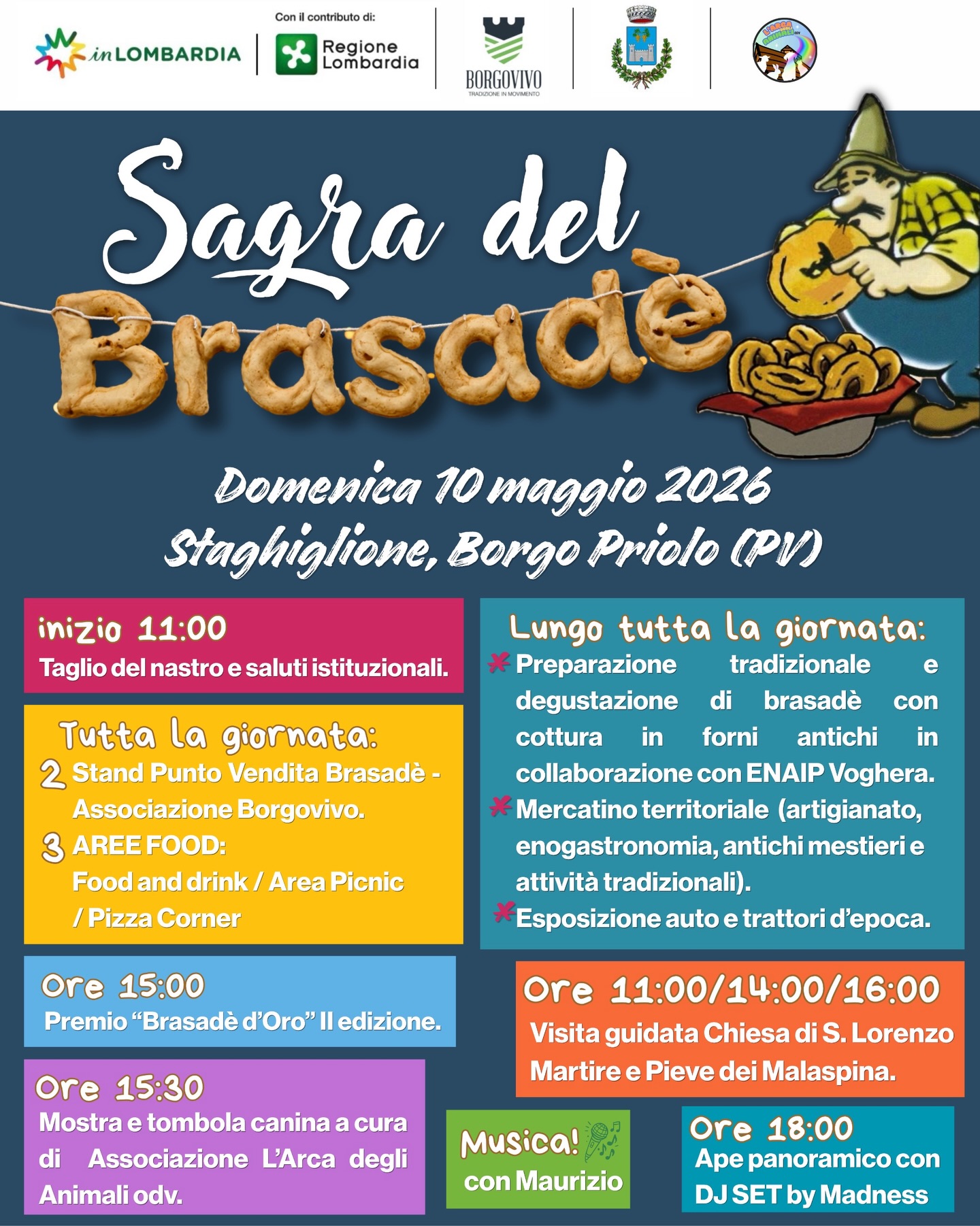Domenica 10 maggio 2026 torna uno degli appuntamenti più autentici della primavera in Oltrepò Pavese: la Sagra del Brasadé, in programma a Staghiglione, frazione di Borgo Priolo. Un evento che celebra un prodotto simbolo della tradizione locale, trasformando un semplice dolce in un racconto collettivo fatto di memoria, identità e convivialità.