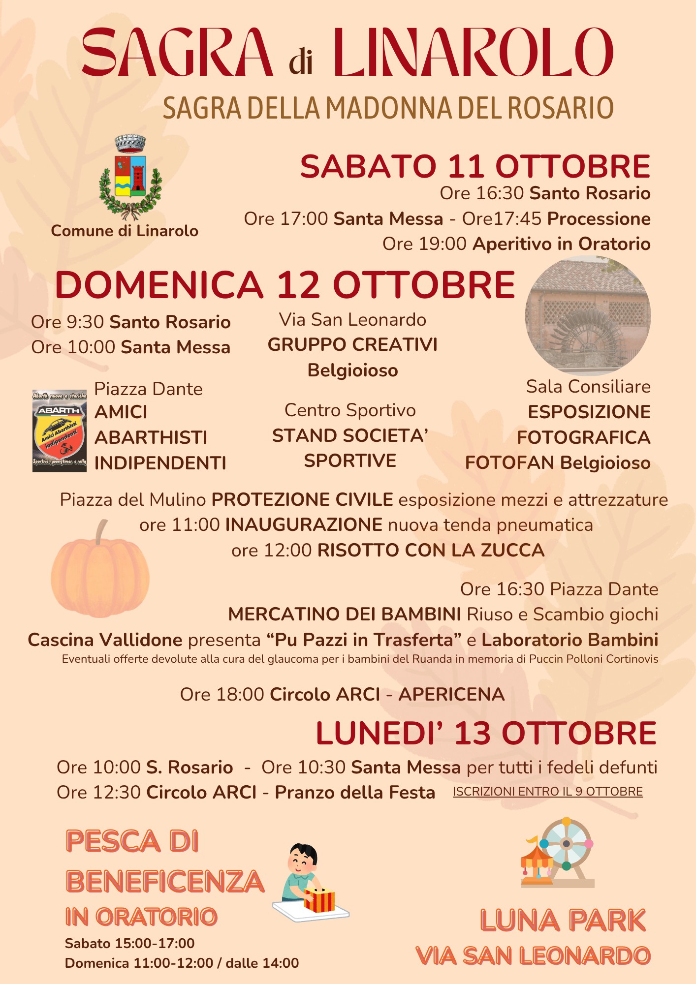 Per tutta la durata della manifestazione, l’oratorio ospita la Pesca di Beneficenza (sabato 15:00–17:00, domenica 11:00–12:00 e dalle 14:00) mentre in Via San Leonardo sarà attivo il Luna Park, punto di riferimento per il divertimento dei più piccoli.