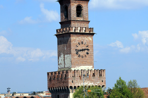 I primi quattro piani sono aperti al pubblico: attraverso una scala interna di circa 100 gradini si raggiunge il terrazzino panoramico con merlatura ghibellina, a circa 31 metri di altezza dal cortile del castello. Da qui lo sguardo spazia a 360 gradi: la Piazza Ducale si apre sotto di voi come un capolavoro in miniatura, i tetti del centro storico si distendono fino alle chiese, e nelle giornate limpide l'orizzonte si allunga fino alle acque del Ticino. In condizioni di cielo sereno, i più fortunati potranno scorgere il profilo delle Alpi - dal Monte Rosa al Cervino fino alle cime lombarde.